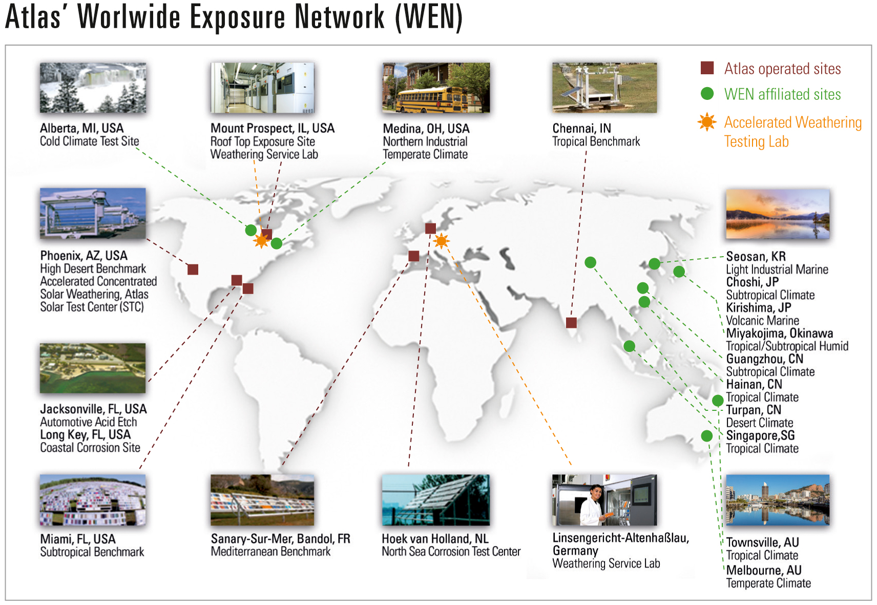 Atlas Weathering Services Group (AWSG), is offering a Worldwide Exposure Network (WEN) of own testing facilities and partner sites. With enhanced exposure sites and services in the Americas, Europe, Asia, and Australia, AWSG offers customers cohesive, expertly orchestrated exposure testing throughout the world. Customers have the opportunity to gather extensive information on the durability of their material in different world markets.