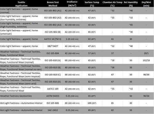 There are many xenon standards for textiles, both national and international. The table lists the 15 most commonly used testing standards: