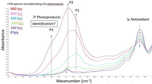 FTIR analysis of an accelerated photoaging SEPAP test of a UV-stabilized polymer over 900 h, monitoring degradation products P1-3 and simultaneous antioxidant (stabilizer) reduction. Image courtesy of CNEP.