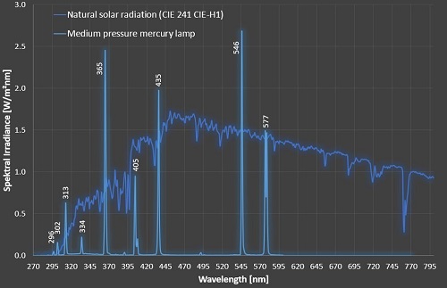 Spectrum comparison medium pressure mercury lamp vs natural solar radiation