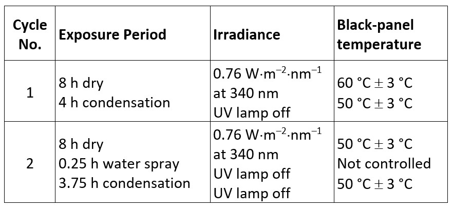 Cycles 3 and 4 (not shown here) have longer water spray periods and no condensation. These were originally intended for climatic chamber type devices but are used today for both instrument types. Climatic chamber type instruments control relative humidity and chamber air temperature but not the sample surface temperature (black panel). Consequently, there are now separate cycles for these instruments in an additional table (also not shown here).
