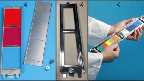 Specimen preparations for Atlas Xenotest: a) with closed backing, b) with open backing, c) on bleach-free cardboard