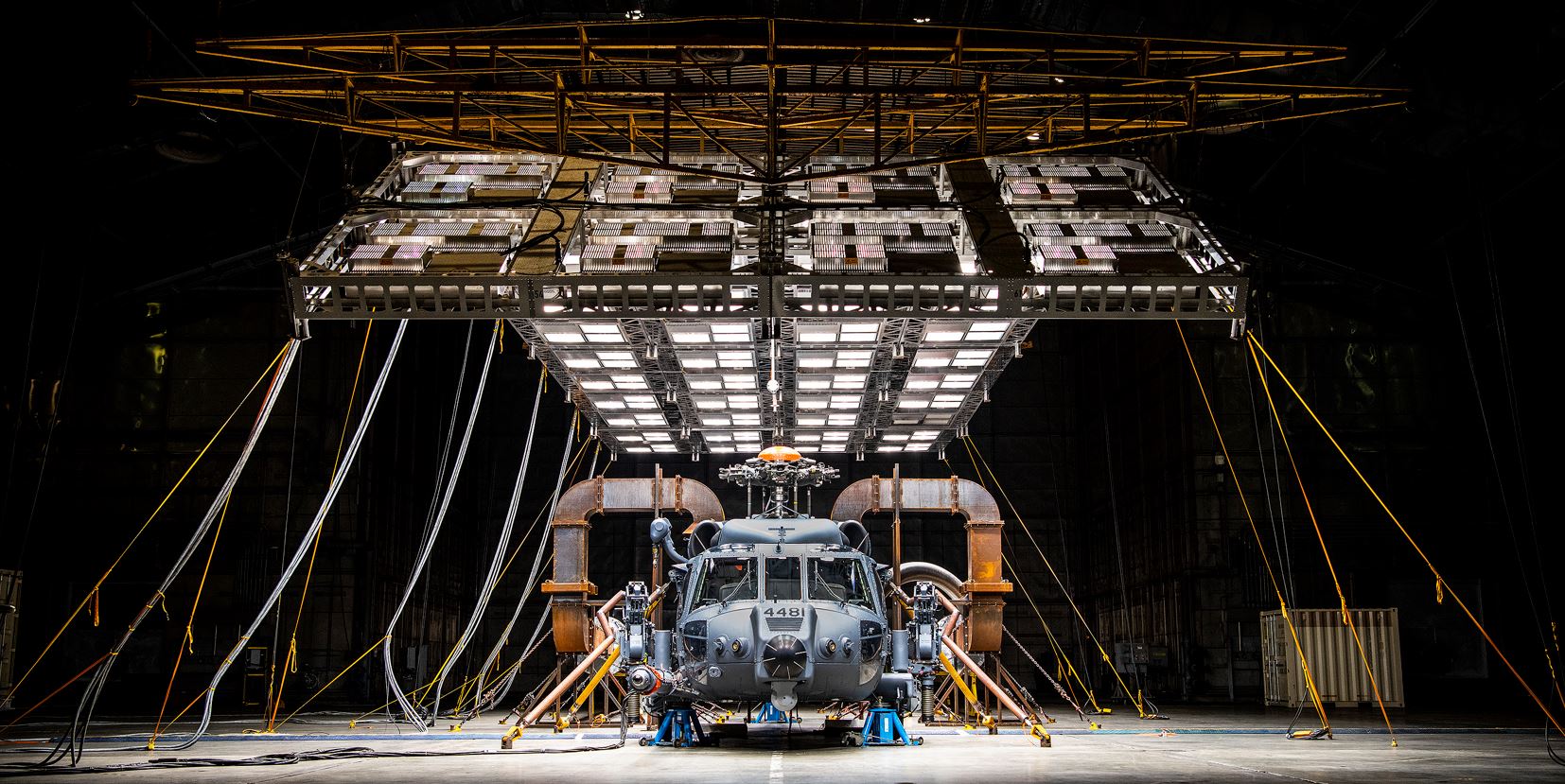 Large scale Atlas solar simulator used for solar heat load testing of a military helicopter against MIL-STD-810H (photo by Samuel King Jr.)