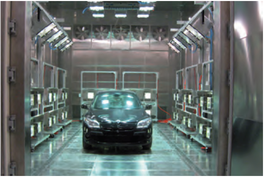 These tests require flexible large scale solar environmental test chambers that can realistically replicate worst-case scenario conditions. These large-scale systems typically have a design that allows for simulation of solar days and longer term realistic extreme solar testing such as described in MIL-STD-810H procedures I and II, or special custom-designed drive-in solar environmental chambers, originally developed for cars.